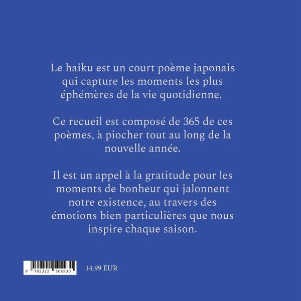 Le haïku est un court poème japonais qui capture les moments les plus éphémères de la vie quotidienne. Ce recueil est composé de 365 de ces poèmes, à piocher tout au long de la nouvelle année. Il est un appel à la gratitude pour les moments de bonheur qui jalonnent notre existence, à travers les émotions bien particulière que nous inspire chaque saison.