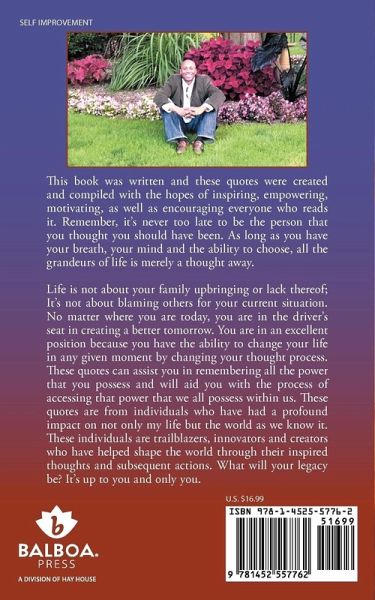 This book was written and these quotes were created and compiled with the hopes of inspiring, empowering, motivating, as well as encouraging everyone who reads it. Remember, it's never too late to be the person that you thought you should have been. As long as you have your breath, your mind and the ability to choose, all the grandeurs of life is merely a thought away. Life is not about your family upbringing or lack thereof; It's not about blaming others for your current situation. No matter where you are today, you are in the driver's seat in creating a better tomorrow. You are in an excellent position because you have the ability to change your life in any given moment by changing your thought process. These quotes can assist you in remembering all the power that you possess and will aid you with the process of accessing that power that we all possess within us. These quotes are from individuals who have had a profound impact on not only my life but the world as we know it. These individuals are trailblazers, innovators and creators who have helped shape the world through their inspired thoughts and subsequent actions. What will your legacy be? It's up to you and only you.