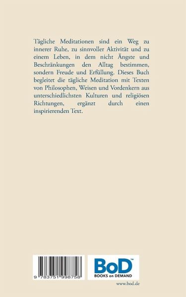Tägliche Meditationen sind ein Weg zu innerer Ruhe, zu sinnvoller Aktivität und zu einem Leben, in dem nicht Ängste und Beschränkungen den Alltag bestimmen, sondern Freude und Erfüllung. Dieses Buch begleitet die tägliche Meditation mit Texten von Philosophen, Weisen und Vordenkern aus unterschiedlichsten Kulturen und religiösen Richtungen, ergänzt durch einen inspirierenden Text.
