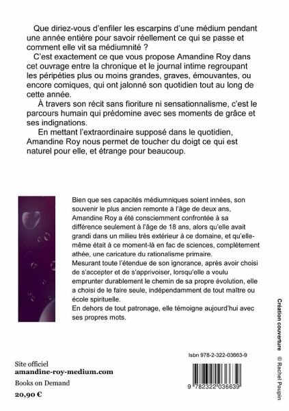Que diriez-vous d'enfiler les escarpins d'une médium pendant une année entière pour savoir réellement ce qui se passe et comment elle vit sa médiumnité ?C'est exactement ce que vous propose Amandine Roy dans cet ouvrage entre la chronique et le journal intime regroupant les péripéties plus ou moins grandes, graves, émouvantes, ou encore comiques, qui ont jalonné son quotidien tout au long de l'année.À travers son récit sans fioriture ni sensationnalisme, c'est le parcours humain qui prédomine avec ses moments de grâce et ses indignations.En mettant l'extraordinaire supposé dans le quotidien, Amandine Roy nous permet de toucher du doigt ce qui est naturel pour elle, et étrange pour beaucoup.