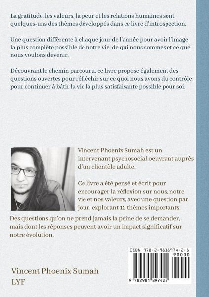 La gratitude, les valeurs, la peur et les relations humaines sont quelques-uns des thèmes développés dans ce livre d'introspection. Une question différente à chaque jour de l'année pour avoir l'image la plus complète possible de notre vie, de qui nous sommes et ce que nous voulons devenir. Découvrant le chemin parcouru, ce livre propose également des questions ouvertes pour réfléchir sur ce quoi nous avons du contrôle pour continuer à bâtir la vie la plus satisfaisante possible pour soi.