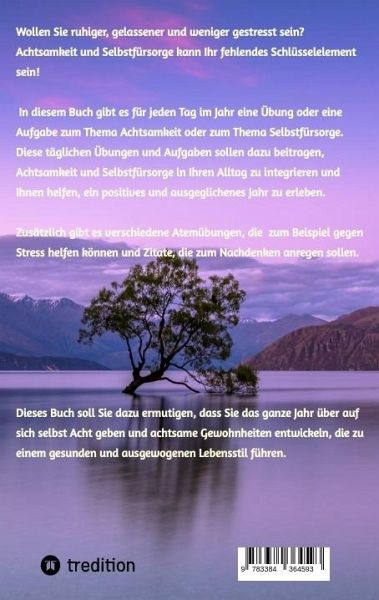 Wollen Sie ruhiger, gelassener und weniger gestresst sein? Achtsamkeit und Selbstfürsorge kann Ihr fehlendes Schlüsselelement sein! In diesem Buch gibt es für jeden Tag im Jahr eine Übung oder eine Aufgabe zum Thema Achtsamkeit oder zum Thema Selbstfürsorge. Diese täglichen Übungen und Aufgaben sollen dazu beitragen, Achtsamkeit und Selbstfürsorge in Ihren Alltag zu integrieren und Ihnen helfen, ein positives und ausgeglichenes Jahr zu erleben.Zusätzlich gibt es mehrere Atemübungen und Zitate, die zum Nachdenken anregen sollen.Dieses Buch soll Sie dazu ermutigen, dass Sie das ganze Jahr über auf sich selbst Acht geben und achtsame Gewohnheiten entwickeln, die zu einem gesunden und ausgewogenen Lebensstil führen.