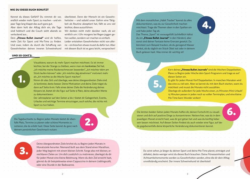 Mit diesem Fitness-Tagebuch integrierst du ganz einfach mehr Bewegung und Achtsamkeit in dein Leben. Es kombiniert die Flexibilität eines klassischen Bullet Journals mit einem strukturierten Fokus auf Fitness und Wohlbefinden. Die Wochen- und Monatsübersichten lassen sich unabhängig vom Kalenderjahr nutzen, sodass du jederzeit starten kannst - ganz nach deinem Tempo.