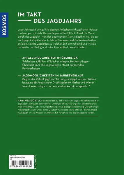 Innerhalb eines Jagdjahres, das vom 1. April bis zum 31. März geht, fallen verschiedene Arbeiten und Aufgaben für den Jäger an. Auch die Jagdmöglichkeiten unterscheiden sich je nach Zeitpunkt teils erheblich. Dieses Buch gibt einen umfassenden und chronologisch geordneten Überblick über alle Revierarbeiten und jagdlichen Möglichkeiten im Verlauf des Jagdjahres und ist das ideale Geschenk für Jagdneulinge und Jäger mit eigenem Revier.