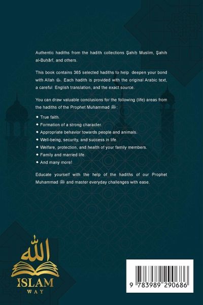 365 selected hadiths for a fulfilled life as a Muslim Hadiths are collections of traditions containing statements and actions of the Prophet Muhammad ¿, and the statements and actions of third parties that Muhammad ¿ tacitly accepted and approved. The hadiths serve us Muslims as a guide and decision-making aid in a wide variety of everyday situations and events. This book contains 365 selected hadiths to help you deepen your bond with Allah. Each hadith is provided with the original Arabic text, a careful English translation, and the exact source. From the hadiths of the Prophet Muhammad ¿in this Islam book you can draw valuable conclusions for the following areas of life:Obtaining true faith in Allah. ¿ Building a strong character. Relief from worries and hardships. Welfare, protection, and health of your family members. Access to paradise. Protection from sins and hell. Relief from pain and illness. Appropriate behavior towards people and animals. Achieving well-being, security, and success in your life. Family and married life. Forgiveness. Interpersonal behavior. And more!