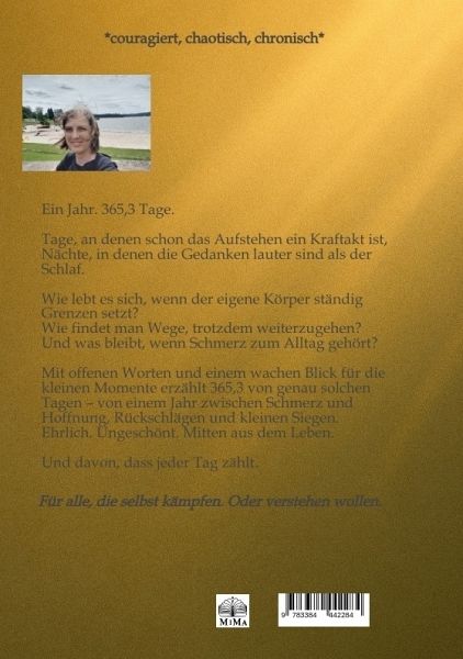 Ein Jahr, 365,3 Tage:voller Höhen und Tiefen, Schmerzen und Hoffnungen, Zweifeln und kleinen Siegen. Dieses Buch ist keine Heldengeschichte, sondern eine Reise - ehrlich, roh, mitten aus dem Leben.Wie fühlt es sich an, wenn der eigene Körper ständig Grenzen setzte? Wie findet man Wege, trotzdem weiterzumachen? Und was bleibt, wenn Schmerzen zum Alltag gehören? Mit offenen Worten und einem wachen Blick für die kleinen Momente erzählt 365,3 von dem Leben mit einer chronisch rheumatischen Erkrankung - und davon, dass jeder Tag zählt.