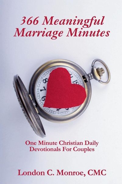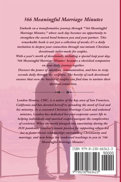 Are you seeking a spiritual "reconnection" with your spouse? Have you felt that your home Bible study or scripture-related devotional time is neglected due to busy schedules, distractions, or time constraints? Do you want to reignite your spiritual connection to your spouse and live your Christian marriage as God intended? Suppose you've answered YES to any of these questions. In that case, London Monroe's '366 Meaningful Marriage Minutes' will jump-start the marital connection for couples AND your spiritual reconnection to God each day - in less time than it takes to brew a cup of coffee. This bedside nightstand book will shepherd you on a transformative journey through "366 Meaningful Marriage Minutes," where each day becomes an opportunity to connect, and strengthen the sacred bond between you and your partner. This remarkable book is not just a collection of words; it's a daily invitation to deepen your connection through one-minute Christian devotionals tailor-made for couples. Gain insights into the wisdom of the Bible as each page unveils a carefully selected chapter and verse, providing a solid foundation for reflection. For each bible verse, you'll reflect on "What does this mean for us?". This reflection opens the door to profound insights, helping you apply ancient teachings to the intricacies of modern relationships. The "Modern day meaning" section for each verse bridges the gap between timeless scriptures and your everyday life, offering practical guidance that resonates today. As each page draws to a close, a heartfelt prayer awaits. Pray together in a shared moment that elevates your marital bond to new heights. Let this book be your guide, weaving faith into the fabric of your marriage and creating a tapestry of love that lasts a lifetime. With a year's worth of devotionals, including a special leap year day, "366 Meaningful Marriage Minutes" becomes a cherished companion on your daily journey together. Discover the power of intention, communication, and love in sixty seconds daily through the scripture. The brevity of each devotional ensures that even the busiest couples can find time to nurture their spiritual connection. Are you ready to embark on a year-long adventure that will transform your marriage one minute at a time? Grab "366 Meaningful Marriage Minutes" TODAY and let the year-long journey begin!
