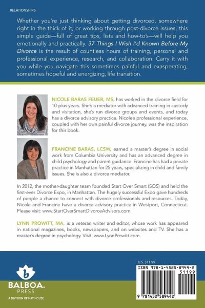 Whether you¿re just thinking about getting divorced, somewhere right in the thick of it, or working through post-divorce issues, this simple guide¿full of great tips, lists and how-tös¿will help you emotionally and practically. 37 Things I Wish I¿d Known Before My Divorce is the result of countless hours of training, personal and professional experience, research, and collaboration. Carry it with you while you navigate this sometimes painful and exasperating, sometimes hopeful and energizing, life transition.