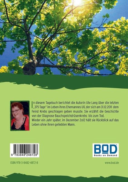 In diesem Tagebuch berichtet die Autorin Ute Lang über die letzten "375 Tage" im Leben ihres Ehemannes Uli, der sich am 31.12.2011 dem Feind Krebs geschlagen geben musste.Sie erzählt die Geschichte von der Diagnose Bauchspeichdrüsenkrebs bis zum Tod.Wieder ein Jahr später, im Dezember 2o12 hält sie Rückblick auf das Leben ohne ihre geliebten Mann.