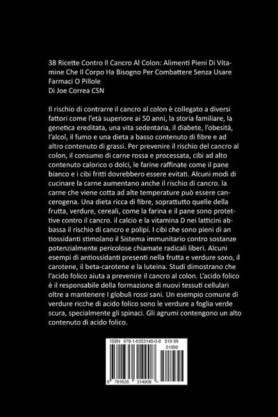 38 Ricette Contro Il Cancro Al Colon: Alimenti Pieni Di Vitamine Che Il Corpo Ha Bisogno Per Combattere Senza Usare Farmaci O Pillole Di Joe Correa CSN Il rischio di contrarre il cancro al colon è collegato a diversi fattori come l'età superiore ai 50 anni, la storia familiare, la genetica ereditata, una vita sedentaria, il diabete, l'obesità, l'alcol, il fumo e una dieta a basso contenuto di fibre e ad altro contenuto di grassi. Per prevenire il rischio del cancro al colon, il consumo di carne rossa e processata, cibi ad alto contenuto calorico o dolci, le farine raffinate come il pane bianco e i cibi fritti dovrebbero essere evitati. Alcuni modi di cucinare la carne aumentano anche il rischio di cancro. la carne che viene cotta ad alte temperature può essere cancerogena. Una dieta ricca di fibre, soprattutto quelle della frutta, verdure, cereali, come la farina e il pane sono protettive contro il cancro. il calcio e la vitamina D nei latticini abbassa il rischio di cancro e polipi. I cibi che sono pieni di antiossidanti stimolano il Sistema immunitario contro sostanze potenzialmente pericolose chiamate radicali liberi. Alcuni esempi di antiossidanti presenti nella frutta e verdure sono, il carotene, il beta-carotene e la luteina. Studi dimostrano che l'acido folico aiuta a prevenire il cancro al colon. L'acido folico è il responsabile della formazione di nuovi tessuti cellulari oltre a mantenere I globuli rossi sani. Un esempio comune di verdure ricche di acido folico sono le verdure a foglia verde scura, specialmente gli spinaci. Gli agrumi contengono un alto contenuto di acido folico.