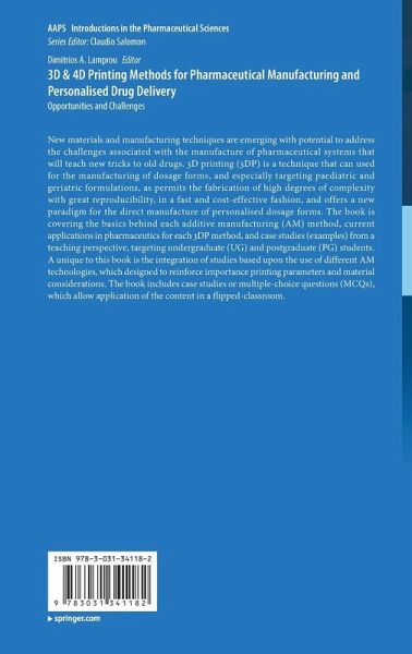 New materials and manufacturing techniques are emerging with potential to address the challenges associated with the manufacture of pharmaceutical systems that will teach new tricks to old drugs. 3D printing (3DP) is a technique that can used for the manufacturing of dosage forms, and especially targeting paediatric and geriatric formulations, as permits the fabrication of high degrees of complexity with great reproducibility, in a fast and cost-effective fashion, and offers a new paradigm for the direct manufacture of personalised dosage forms. The book is covering the basics behind each additive manufacturing (AM) method, current applications in pharmaceutics for each 3DP method, and case studies (examples) from a teaching perspective, targeting undergraduate (UG) and postgraduate (PG) students. A unique to this book is the integration of studies based upon the use of different AM technologies, which designed to reinforce importance printing parameters and material considerations. The book includes case studies or multiple-choice questions (MCQs), which allow application of the content in a flipped-classroom.