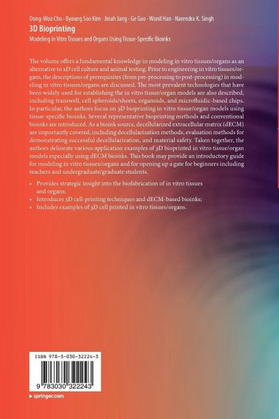 Introduction.- Definition, necessity, and prerequisites for modeling 3D tissues and organs.- Prevalent technologies for in vitro tissue/organ biofabrication.- 3D cell printing techniques.- Decellularized extracellular matrix-based bioinks.- Skin.- Blood vessels.- Liver.- Kidney.- Cardiac.- Airway.- Brain.- Muscle.- Conclusion and future perspective