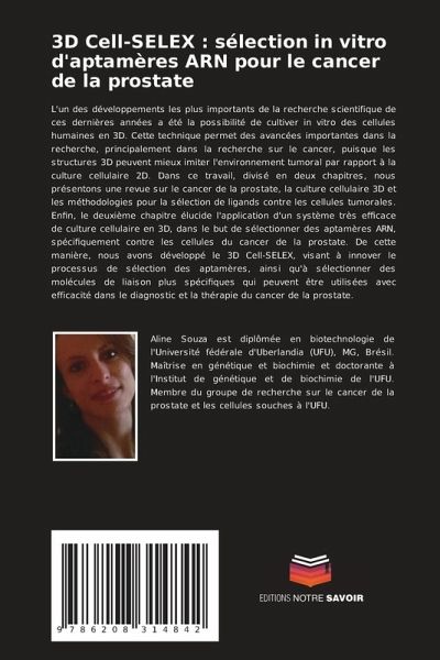 L'un des développements les plus importants de la recherche scientifique de ces dernières années a été la possibilité de cultiver in vitro des cellules humaines en 3D. Cette technique permet des avancées importantes dans la recherche, principalement dans la recherche sur le cancer, puisque les structures 3D peuvent mieux imiter l'environnement tumoral par rapport à la culture cellulaire 2D. Dans ce travail, divisé en deux chapitres, nous présentons une revue sur le cancer de la prostate, la culture cellulaire 3D et les méthodologies pour la sélection de ligands contre les cellules tumorales. Enfin, le deuxième chapitre élucide l'application d'un système très efficace de culture cellulaire en 3D, dans le but de sélectionner des aptamères ARN, spécifiquement contre les cellules du cancer de la prostate. De cette manière, nous avons développé le 3D Cell-SELEX, visant à innover le processus de sélection des aptamères, ainsi qu'à sélectionner des molécules de liaison plus spécifiques qui peuvent être utilisées avec efficacité dans le diagnostic et la thérapie du cancer de la prostate.