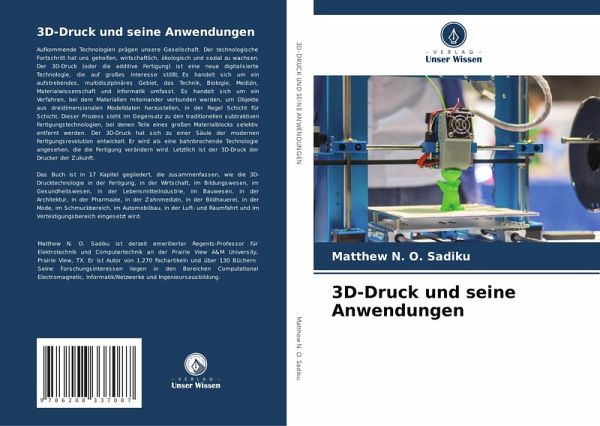 Aufkommende Technologien prägen unsere Gesellschaft. Der technologische Fortschritt hat uns geholfen, wirtschaftlich, ökologisch und sozial zu wachsen. Der 3D-Druck (oder die additive Fertigung) ist eine neue digitalisierte Technologie, die auf großes Interesse stößt. Es handelt sich um ein aufstrebendes, multidisziplinäres Gebiet, das Technik, Biologie, Medizin, Materialwissenschaft und Informatik umfasst. Es handelt sich um ein Verfahren, bei dem Materialien miteinander verbunden werden, um Objekte aus dreidimensionalen Modelldaten herzustellen, in der Regel Schicht für Schicht. Dieser Prozess steht im Gegensatz zu den traditionellen subtraktiven Fertigungstechnologien, bei denen Teile eines großen Materialblocks selektiv entfernt werden. Der 3D-Druck hat sich zu einer Säule der modernen Fertigungsrevolution entwickelt. Er wird als eine bahnbrechende Technologie angesehen, die die Fertigung verändern wird. Letztlich ist der 3D-Druck der Drucker der Zukunft.Das Buch ist in 17 Kapitel gegliedert, die zusammenfassen, wie die 3D-Drucktechnologie in der Fertigung, in der Wirtschaft, im Bildungswesen, im Gesundheitswesen, in der Lebensmittelindustrie, im Bauwesen, in der Architektur, in der Pharmazie, in der Zahnmedizin, in der Bildhauerei, in der Mode, im Schmuckbereich, im Automobilbau, in der Luft- und Raumfahrt und im Verteidigungsbereich eingesetzt wird.