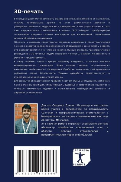 V poslednie desqtiletiq 3D-pechat' okazala znachitel'noe wliqnie na stomatologiü, powysiw kwalifikaciü wrachej za schet realistichnogo obucheniq i usowershenstwowannogo hirurgicheskogo planirowaniq. Integraciq 3D-pechati, CAD-CAM, wnutrirotowogo skanirowaniq i dannyh CBCT obladaet preobrazuüschim potencialom, sozdawaq slozhnye konstrukcii dlq issledowanij, planirowaniq lecheniq, obucheniq i prepodawaniq.3D-pechat' i cifrowaq stomatologiq proizweli rewolüciü w stomatologicheskoj tochnosti, sokratiw kolichestwo klinicheskogo oborudowaniq i wremq raboty w kresle. Jeto rasprostranqetsq i na slozhnye cherepno-licewye operacii, gde hirurgicheskie rukowodstwa i 3D-pechatnye modeli powyshaüt tochnost', snizhaüt inwaziwnost' i uluchshaüt predskazuemost'.K chislu problem, prepqtstwuüschih shirokomu wnedreniü, otnosqtsq nehwatka kwalificirowannyh operatorow, bolee wysokie rashody, ogranichennost' materialow, neobhodimost' posleduüschej obrabotki, tehnicheskogo obsluzhiwaniq i soblüdeniq prawil bezopasnosti. Tekuschie razrabotki swidetel'stwuüt o suschestwennyh izmeneniqh w stomatologii.Dlq raskrytiq ätih dostizhenij trebuütsq nastoqtel'nye issledowaniq, osobenno w takih regionah, kak Indiq, chtoby uluchshit' zdorow'e i samochuwstwie pacientow s pomosch'ü komplexnyh podhodow k ispol'zowaniü preimuschestw 3D-pechati i cifrowoj stomatologii.