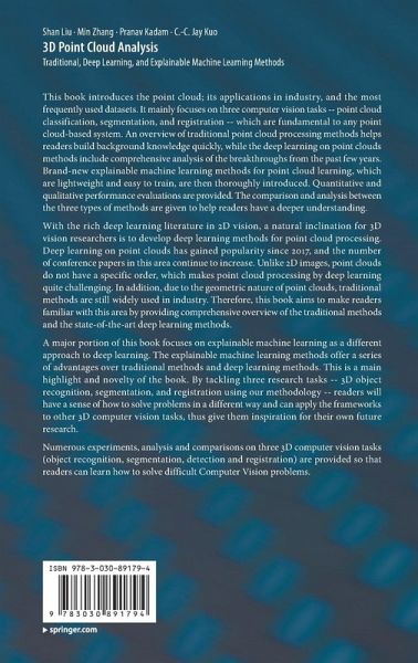 This book introduces the point cloud; its applications in industry, and the most frequently used datasets. It mainly focuses on three computer vision tasks -- point cloud classification, segmentation, and registration -- which are fundamental to any point cloud-based system. An overview of traditional point cloud processing methods helps readers build background knowledge quickly, while the deep learning on point clouds methods include comprehensive analysis of the breakthroughs from the past few years. Brand-new explainable machine learning methods for point cloud learning, which are lightweight and easy to train, are then thoroughly introduced. Quantitative and qualitative performance evaluations are provided. The comparison and analysis between the three types of methods are given to help readers have a deeper understanding.