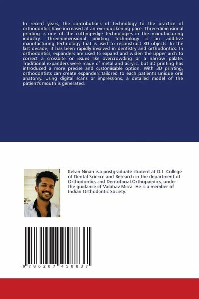 In recent years, the contributions of technology to the practice of orthodontics have increased at an ever-quickening pace. Three-dimensional printing is one of the cutting-edge technologies in the manufacturing industry. Three-dimensional printing technology is an additive manufacturing technology that is used to reconstruct 3D objects. In the last decade, it has been rapidly involved in dentistry and orthodontics. In orthodontics, expanders are used to expand and widen the upper arch to correct a crossbite or issues like overcrowding or a narrow palate. Traditional expanders were made of metal and acrylic, but 3D printing has introduced a more precise and customisable option. With 3D printing, orthodontists can create expanders tailored to each patient's unique oral anatomy. Using digital scans or impressions, a detailed model of the patient's mouth is generated.