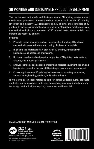 The text covers advanced concepts of 3D printing, product development, design, sustainability, along with 3D printing applications. It will serve as an ideal reference text for senior undergraduate, graduate students, and researchers in diverse engineering domains including manufacturing, mechanical, aerospace, automotive, and industrial.