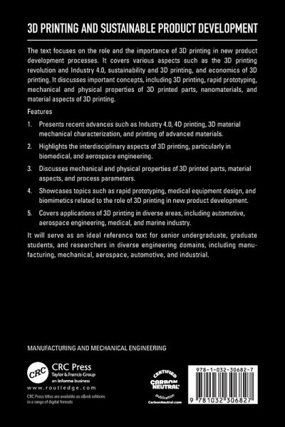 The text covers advanced concepts of 3D printing, product development, design, sustainability, along with 3D printing applications. It will serve as an ideal reference text for senior undergraduate, graduate students, and researchers in diverse engineering domains including manufacturing, mechanical, aerospace, automotive, and industrial.