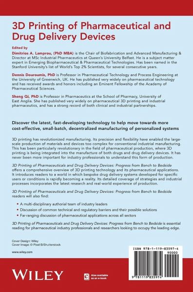 Edited by Dimitrios A. Lamprou, (PhD MBA) is the Chair of Biofabrication and Advanced Manufacturing & Director at MSc Industrial Pharmaceutics at Queen's University Belfast. He is a subject matter expert in Emerging Biopharmaceutical & Pharmaceutical Technologies. Has been named in the Stanford University's list of World's Top 2% Scientists, for several consecutive years. Dennis Douroumis, PhD is Professor in Pharmaceutical Technology and Process Engineering at the University of Greenwich, UK. He has published very widely on pharmaceutical technology and has received awards and honors including an Eminent Fellowship of the Academy of Pharmaceutical Sciences. Sheng Qi, PhD is Professor in Pharmaceutics at the School of Pharmacy, University of East Anglia. She has published very widely on pharmaceutical 3D printing and industrial pharmaceutics, and has a strong record of both clinical and industrial partnerships.