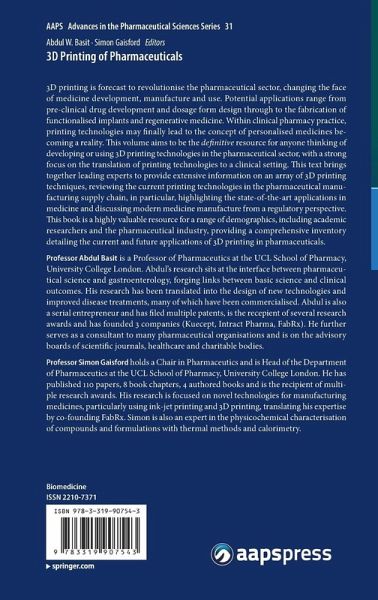 3D printing is forecast to revolutionise the pharmaceutical sector, changing the face of medicine development, manufacture and use. Potential applications range from pre-clinical drug development and dosage form design through to the fabrication of functionalised implants and regenerative medicine. Within clinical pharmacy practice, printing technologies may finally lead to the concept of personalised medicines becoming a reality. This volume aims to be the definitive resource for anyone thinking of developing or using 3D printing technologies in the pharmaceutical sector, with a strong focus on the translation of printing technologies to a clinical setting. This text brings together leading experts to provide extensive information on an array of 3D printing techniques, reviewing the current printing technologies in the pharmaceutical manufacturing supply chain, in particular, highlighting the state-of-the-art applications in medicine and discussing modern drug product manufacture from a regulatory perspective. This book is a highly valuable resource for a range of demographics, including academic researchers and the pharmaceutical industry, providing a comprehensive inventory detailing the current and future applications of 3D printing in pharmaceuticals.