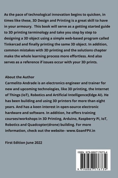 As the pace of technological innovation begins to quicken, in times like these, 3D Design and Printing is a great skill to have in your armoury. This book will serve as a getting started guide to 3D printing terminology and take you step by step to designing a 3D object using a simple web-based program called Tinkercad and finally printing the same 3D object. In addition, common mistakes with 3D printing and the solutions chapter make the whole learning process more effortless. And also serves as a reference if issues occur with your 3D prints.