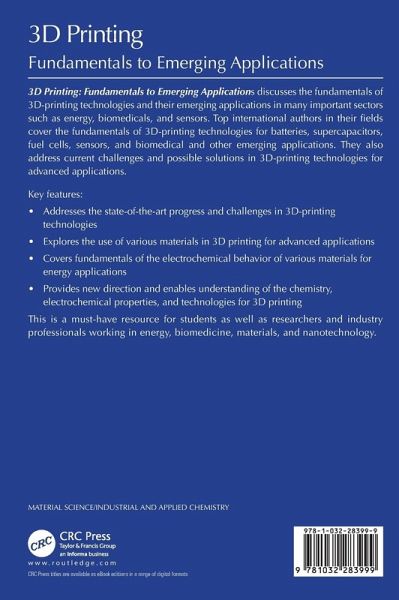 This comprehensive work provides the fundamentals of 3D printing technologies, current state-of-the-art knowledge, and their emerging applications. This is a suitable textbook for students and a must-have resource for researchers and industry professionals working in energy, biomedical, materials, and nanotechnology fields.