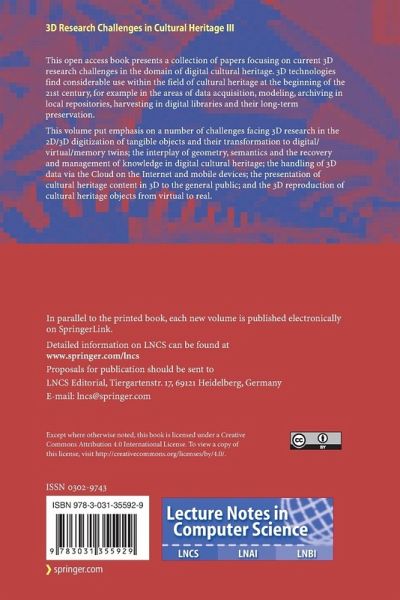 This open access book presents a collection of papers focusing on current 3D research challenges in the domain of digital cultural heritage. 3D technologies find considerable use within the field of cultural heritage at the beginning of the 21st century, for example in the areas of data acquisition, modeling, archiving in local repositories, harvesting in digital libraries and their long-term preservation.
