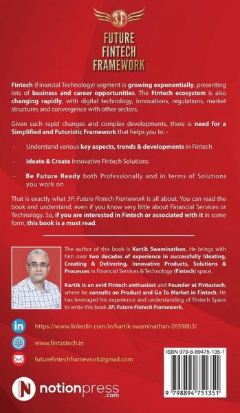 Fintech (Financial Technology) segment is growing exponentially, presenting lots of business and career opportunities. The Fintech ecosystem is also changing rapidly, with digital technology, innovations, regulations, market structures and convergence with other sectors. Given such rapid changes and complex developments, there is need for a Simplified and Futuristic Framework that helps you to: - - Understand various key aspects, trends & developments in Fintech - Ideate & Create Innovative Fintech Solutions - Be Future Ready both Professionally and in terms of Solutions you work on That is exactly what 3F: Future Fintech Framework is all about. You can read the book and understand, even if you know very little about Financial Services or Technology. So, if you are interested in Fintech or associated with it in some form, this book is a must read.