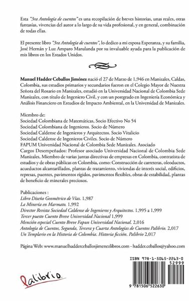 Esta "3ra Antología de cuentos" es una recopilación de breves historias, unas reales, otras fantasías, vivencias del autor a lo largo de su vida profesional, y en general, combinación de todas ellas. El presente libro "3ra Antología de cuentos", lo dedico a mi esposa Esperanza, y su familia, José Hernán y Luz Amparo Marulanda por su invaluable ayuda para la publicación de mis libros en los Estados Unidos.