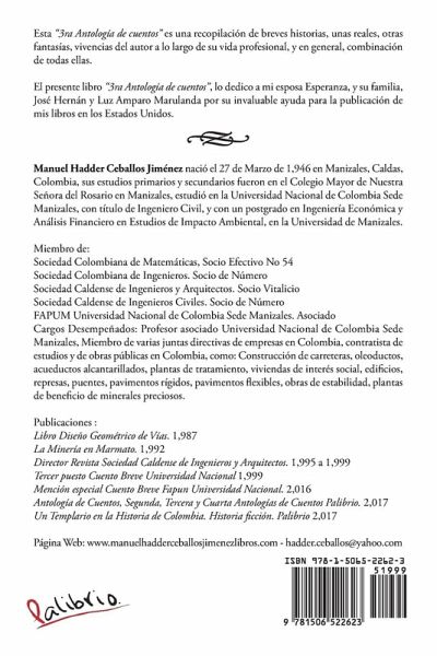 Esta "3ra Antología de cuentos" es una recopilación de breves historias, unas reales, otras fantasías, vivencias del autor a lo largo de su vida profesional, y en general, combinación de todas ellas. El presente libro "3ra Antología de cuentos", lo dedico a mi esposa Esperanza, y su familia, José Hernán y Luz Amparo Marulanda por su invaluable ayuda para la publicación de mis libros en los Estados Unidos.