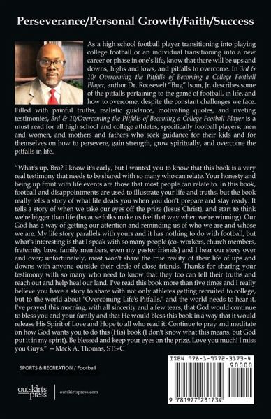 As a high school athlete transitioning into playing college sports or an individual transitioning into a new career or phase in one's life, know that there will be ups and downs, highs and lows, and pitfalls to overcome. In 3rd & 10/ Overcoming the Pitfalls of Becoming a College Football Player, author Dr. Roosevelt "Bug" Isom, Jr. describes some of the pitfalls pertaining to the game of football, in life, and how to overcome, despite the constant challenges we face. Filled with painful truths, realistic guidance, motivating quotes, and riveting testimonies, 3rd & 10/Overcoming the Pitfalls of Becoming a College Football Player is a must read for all high school and college athletes, specifically football players, men and women, and mothers and fathers who seek guidance for their kids and for themselves on how to persevere, gain strength, grow spiritually, and overcome the pitfalls in life. "A famous Chinese proverb states," To know the road ahead, ask those coming back." In other words, if you want to know what to expect on your journey, take the time to learn from someone who has already been there. My friend, Dr. Roosevelt Isom Jr., has not only traveled the roads that you have begun to navigate, but he is also passionate about sharing the biggest lessons from that journey. Through 3rd & 10, he provides a transparent account of both his triumphs and defeats as a Division I student-athlete. Experience is truly the best teacher; however, not all learning experiences have to be your own. If you are committed to being the absolute best college student-athlete that you can be, I encourage you to read every word in this book with a receptive heart and an open mind. In doing so, you will have the opportunity to unlock your fullest potential in every aspect of your life. In my travels to various schools around the country as a motivational speaker, I constantly encounter young athletes who become their own worst enemies in their pursuit of success. Instead of being intentional about the steps they should take to see long-term success both on and off the field, they rely solely on their athletic talent, expecting all of the right cards to simply fall into place. However, the reality is that only 2% of all high school football players actually make it to the NFL, and many football standouts are prepared for neither the academics of college nor for life once their football careers come to an end. If you utilize the tools provided to you within the pages of this book, you can be confident that you will be able to successfully navigate the waters of being a college football player and overcome any pitfalls that commonly hold student-athletes back from achieving their goals. Dr. Isom is a living testimony of the ups and downs that can occur as a result of your decisions both in the classroom and on the football field. As someone who wants to see you succeed, I urge you to consciously carry each of these powerful lessons with you every day as you transition into college football." Your future self will thank you for it! Raven Magwood, International Speaker, Best Selling Author