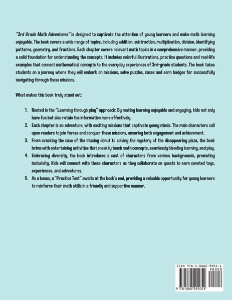 "3rd Grade Math Adventures" is designed to captivate the attention of young learners and make math learning enjoyable. The book covers a wide range of topics, including addition, subtraction, multiplication, division, identifying patterns, geometry, and fractions. Each chapter covers relevant math topics in a comprehensive manner, providing a solid foundation for understanding the concepts. It includes colorful illustrations, practice questions and real-life examples that connect mathematical concepts to the everyday experiences of 3rd-grade students. The book takes students on a journey where they will embark on missions, solve puzzles, cases and earn badges for successfully navigating through these missions. What makes this book truly stand out:Rooted in the "Learning through play" approach: By making learning enjoyable and engaging, kids not only have fun but also retain the information more effectively. Each chapter is an adventure, with exciting missions that captivate young minds. The main characters call upon readers to join forces and conquer these missions, ensuring both engagement and achievement. From cracking the case of the missing donut to solving the mystery of the disappearing pizza, the book brims with entertaining activities that sneakily teach math concepts, seamlessly blending learning, and play. Embracing diversity, the book introduces a cast of characters from various backgrounds, promoting inclusivity. Kids will connect with these characters as they collaborate on quests to earn coveted toys, experiences, and adventures. As a bonus, a "Practice Test" awaits at the book's end, providing a valuable opportunity for young learners to reinforce their math skills in a friendly and supportive manner. Kindly be aware that this book comes in both color and black-and-white versions. The one you are currently viewing is the colored edition.