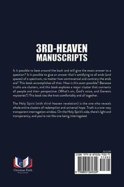 Is it possible to beat around the bush and still give the exact answer to a question? Is it possible to give an answer that's satisfying to all ends (and spaces) of a spectrum, no matter how controversial and contrary the ends are? This book accomplishes all that. How is this even possible? Because truths are clusters, and this book explores a major cluster that connects all people and their perspective. (What's sin, God's voice, and Genesis mysteries?) This book ties the knot comfortably and all together. The Holy Spirit (with third-heaven revelation) is the one who reveals whole entire clusters of redemption and universal hope. Truth is a one-way transparent interrogation window. On the Holy Spirit's side, there's light and transparency, and you're not the one being interrogated.