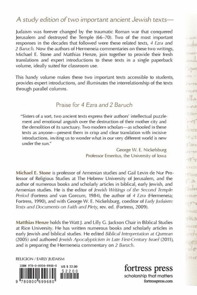 Fresh translations of early Jewish texts 4 Ezra and 2 Baruch, written in the decades after the Judean War, which saw Jerusalem conquered, the temple destroyed, and Judaism changed forever.This handy volume makes these two important texts accessible to students, provides expert introductions, and illuminates the interrelationship of the texts