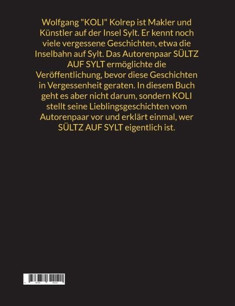 Wolfgang "KOLI" Kolrep ist Makler und Künstler auf der Insel Sylt. Er kennt noch viele vergessene Geschichten, etwa die Inselbahn auf Sylt. Das Autorenpaar SÜLTZ AUF SYLT ermöglichte die Veröffentlichung, bevor diese Geschichten in Vergessenheit geraten. In diesem Buch geht es aber nicht darum, sondern KOLI stellt seine Lieblingsgeschichten vom Autorenpaar vor und erklärt einmal, wer SÜLTZ AUF SYLT eigentlich ist.