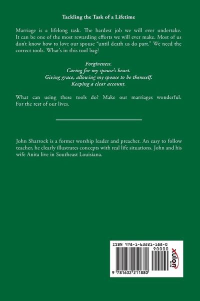 Tackling the Task of a Lifetime Marriage is a lifelong task. The hardest job we will ever undertake. It can be one of the most rewarding efforts we will ever make. Most of us don't know how to love our spouse "until death us do part." We need the correct tools. What's in this tool bag? Forgiveness. Caring for my spouse's heart. Giving grace, allowing my spouse to be themself. Keeping a clear account. What can using these tools do? Make our marriages wonderful. For the rest of our lives.