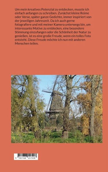 Um mein kreatives Potenzial zu entdecken, musste ich einfach anfangen zu schreiben. Zunächst kleine Reime oder Verse, später ganze Gedichte, immer inspiriert von der jeweiligen Jahreszeit. Da ich auch gerne fotografiere und mit meiner Kamera unterwegs bin, um interessante Motive zu entdecken, eine besondere Stimmung einzufangen oder die Schönheit der Natur zu genießen, ist es eine große Freude, wenn ein tolles Foto entsteht. Diese Freude möchte ich nun mit anderen Menschen teilen.