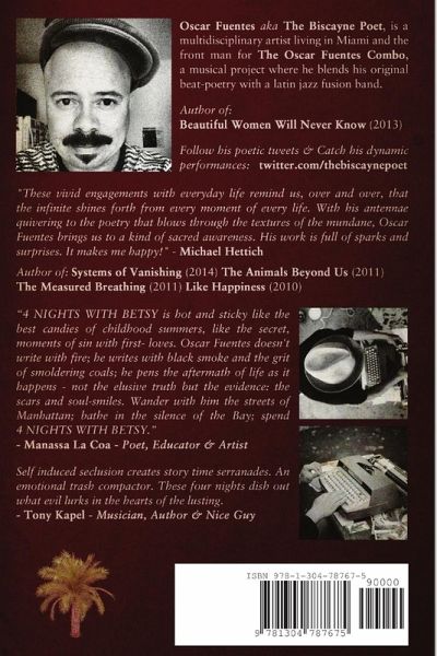 4 NIGHTS WITH BETSY by Oscar Fuentes, is a book of poetry, short stories and plays. Written against a Miami background, Oscar Fuentes aka The Biscayne Poet, romances the muse until the sun rises and sets again.