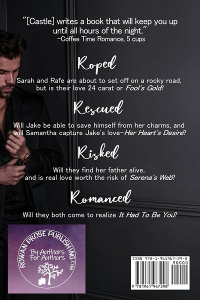 Julie Castle's Complete 4 R's Series! ¿"[Castle] writes a book that will keep you up until all hours of the night." -Coffee Time Romance, 5 cups ROPED: Sarah and Rafe are about to set off on a rocky road, but is their love 24 carat or Fool's Gold? RESCUED: Will Jake be able to save himself from her charms, and will Samantha capture Jake's love-Her Heart's Desire? RISKED: Will they find her father alive, and is real love worth the risk of Serena's Web? ROMANCED: Will they both come to realize It Had To Be You?