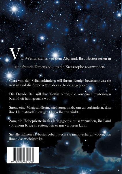Vier Geschichten beginnen. Tauche ein in fantastische Welten und erlebe ein unglaubliches Abenteuer.Die Halbdämonin Ciara zieht los, um ihre Sippe zu retten und ihrem Bruder zu beweisen, dass sie ihm eine würdige Stellvertreterin ist. Mit ihr kommen ihr Verlobter Nate, den sie nicht liebt, und ihr heimlicher Geliebter Bevan, der ihr viel zu nahe steht. Und dann ist da noch der Blutrausch, der sie jederzeit übermannen kann, wenn ihre dämonische Natur die Oberhand gewinnt.Im zweiten Handlungsstrang fiebert die Baumnymphe Bell ihrer Verlobungsfeier entgegen, als sich der Wald, in dem sie lebt, plötzlich verdunkelt. Kurz darauf bricht ihre Muttergöttin zusammen. Bell und die anderen Dryaden müssen nun all ihren Mut zusammennehmen und nach Hilfe für ihre kranke Göttin suchen. Weit außerhalb ihres Waldes.Die Magiestudentin Snow steht kurz vor einer wichtigen Prüfung an der Magieakademie, als ihre Heimatstadt Starcity plötzlich in Dunkelheit versinkt. Ein Ersatz für den magischen Lichtkristall ist nicht zu finden. Zumindest nicht in ihrer Heimatebene. Gemeinsam mit ihrer besten Freundin, dem Mann, den ihr Vater für sie als Ehemann ausgesucht hat und einem unverschämten Fremden muss Snow in ein gefährliches Abenteuer aufbrechen.Im vierten Handlungsstrang steht Zara einer Kriegsdrohung gegenüber. Die Hohepriesterin und Statthalterin des Kriegsgotts muss ihre Schulden bezahlen oder ihr Volk verhungert. Dazu greift sie zu drastischen Maßnahmen, die noch viel größere Schwierigkeiten verursachen. Nur Zara genießt genug Vertrauen von ihrem Gott, um das geradezubiegen. Und die Zeit wird knapp.Brich mit den vier Frauen in ein Abenteuer jenseits deiner Vorstellungskraft auf und begleite sie bei ihrer Suche nach der Rettung für ihre Heimat.Erster Teil der Reihe "4".