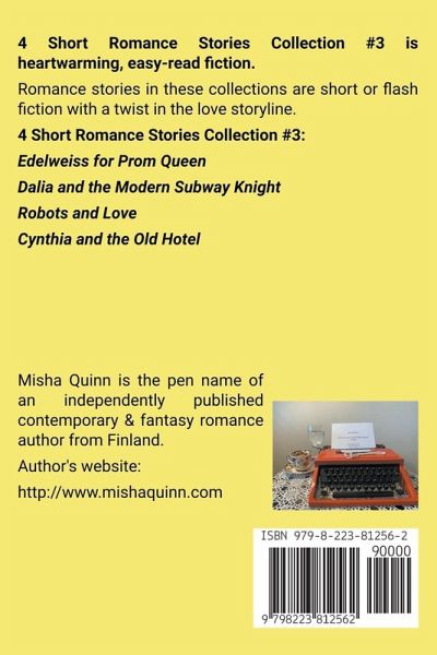 4 Short Romance Stories Collection #3 is heartwarming, easy-read fiction. Romance stories in these collections are short or flash fiction with a twist in the love storyline. These short romance stories are perfect for those seeking an uplifting and satisfying read with brief paragraphs and descriptions. These uplifting romance stories will leave you dreaming and yearning for more. 4 Short Romance Stories Collection #3: Edelweiss for Prom Queen Dalia and the Modern Subway Knight Robots and Love Cynthia and the Old Hotel If you love clean & wholesome, and sweet romance stories with all the feels, let yourself be swept away by love, hope, and the twists of fate that make romance magical. Read the 4 Short Romance Stories Collection #3 today!