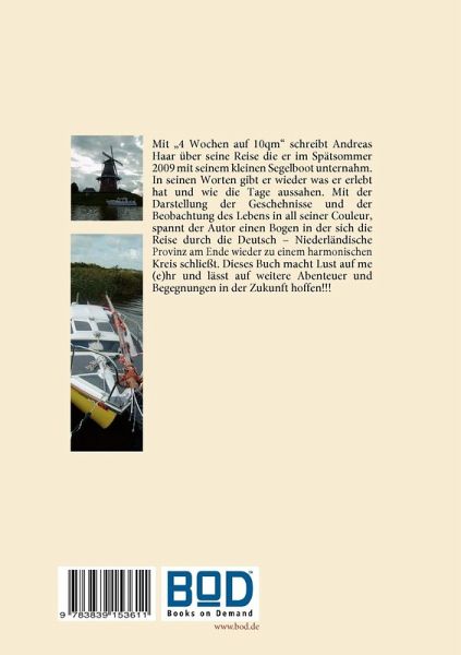 Mit "4 Wochen auf 10qm" schreibt Andreas Haar über seine Reise die er im Spätsommer 2009 mit seinem kleinen Segelboot unternahm. In seinen Worten gibt er wieder was er erlebt hat und wie die Tage aussahen. Mit der Darstellung der Geschehnisse und der Beobachtung des Lebens in all seiner Couleur, spannt der Autor einen Bogen in der sich die Reise durch die Deutsch - Niederländische Provinz am Ende wieder zu einem harmonischen Kreis schließt. Dieses Buch macht Lust auf me(e)hr und lässt auf weitere Abenteuer und Begegnungen in der Zukunft hoffen!!!
