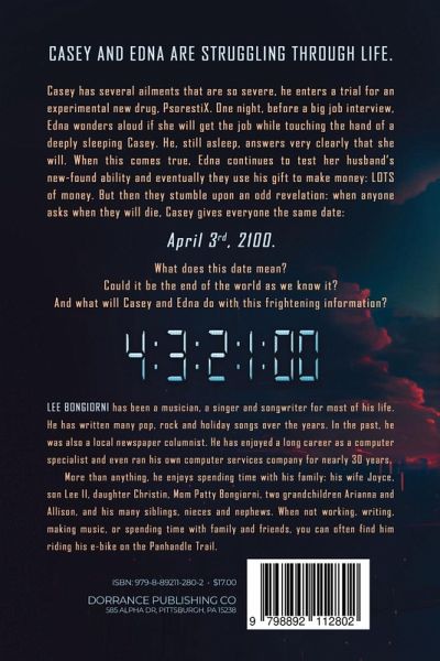 Casey and Edna are struggling through life. Casey has several ailments that are so severe, he enters a trial for an experimental new drug, PsorestiX. One night, before a big job interview, Edna wonders aloud if she will get the job while touching the hand of a deeply sleeping Casey. He, still asleep, answers very clearly that she will. When this comes true, Edna continues to test her husband's new-found ability and eventually they use his gift to make money: LOTS of money. But then they stumble upon an odd revelation: when anyone asks when they will die, Casey gives everyone the same date: April 3rd, 2100. What does this date mean? Could it be the end of the world as we know it? And what will Casey and Edna do with this frightening information? About the Author Lee Bongiorni has been a musician, a singer and songwriter for most of his life. He has written many pop, rock and holiday songs over the years. In the past, he was also a local newspaper columnist. He has enjoyed a long career as a computer specialist and even ran his own computer services company for nearly 30 years. More than anything, he enjoys spending time with his family: his wife Joyce, son Lee II, daughter Christin, Mom Patty Bongiorni, two grandchildren Arianna and Allison, and his many siblings, nieces and nephews. When not working, writing, making music, or spending time with family and friends, you can often find him riding his e-bike on the Panhandle Trail.