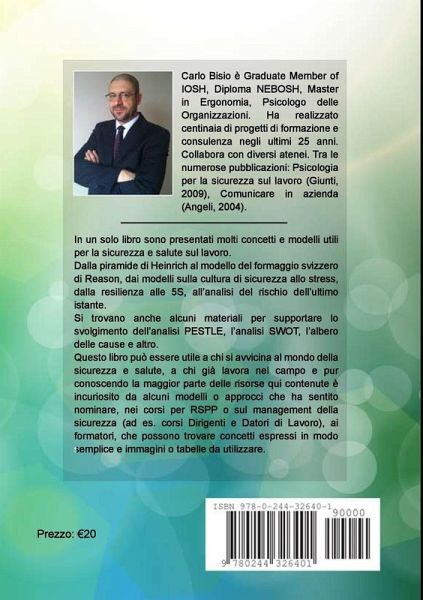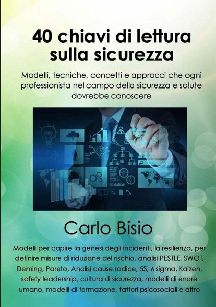 Sono raccolti 40 concetti utili nella sicurezza e salute sul lavoro, fra i quali: Piramide degli incidenti, modelli domino, formaggio svizzero, deriva verso il rischio, bow-tie, resilienza, rischio e pericolo, Job Safety Analysis, gerarchia delle misure, trattamento dei rischi, PESTLE, SWOT, Deming, Pareto, cause radice, 5 S, 6 sigma, Lean thinking, Kaizen, flussi di comunicazione, comunicazione umana, ABC, osservazione di un gruppo, leadership della sicurezza, analisi dell'ultimo istante, errore umano, analisi dell'attività, cultura di sicurezza, clima di sicurezza, modelli di formazione e di apprendimento, modelli di stress e di salute, rischi psicosociali. Contiene alcuni strumenti e checklist (modello bow-tie, Job Safety Analysis, SWOT, albero delle cause, valutazione ex ante della formazione). È utile a chi si avvicina al mondo della sicurezza e salute sul lavoro, e a chi già lavora nel campo; ideale per corsi di formazione per RSPP, per Dirigenti e Datori di Lavoro, HSE Manager.