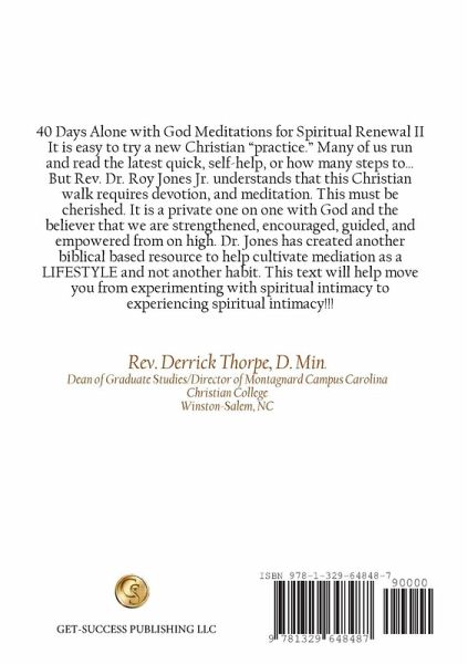 40 Days Alone with God Meditations for Spiritual Renewal II It is easy to try a new Christian "practice." Many of us run and read the latest quick, self-help, or how many steps to... But Rev. Dr. Roy Jones Jr. understands that this Christian walk requires devotion, and meditation. This must be cherished. It is a private one on one with God and the believer that we are strengthened, encouraged, guided, and empowered from on high. Dr. Jones has created another biblical based resource to help cultivate mediation as a LIFESTYLE and not another habit. This text will help move you from experimenting with spiritual intimacy to experiencing spiritual intimacy!!!