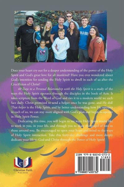 Does your heart cry out for a deeper understanding of the power of the Holy Spirit and God's great love for all mankind? Have you ever wondered about God's intention for sending the Holy Spirit to dwell in each of us after the Crucifixion of Christ? 40 Days to a Personal Relationship with the Holy Spirit is a study of the ways the Holy Spirit operates through the disciples in the book of Acts. It takes scripture from the Word of God and ties it to a modern world we each face daily. Christ promised to send a helper once he was gone, and He did! That helper is the Holy Spirit, and by better understanding how He operates in each of us, we can stay more aligned with God's plan and begin to operate in Holy Spirit Power. Dedicating this time, you will begin to see ways Holy Spirit would like to work in you, in your life, and through you to share the gospel of love to those around you. Be encouraged to open your heart and mind to the ways of Holy Spirit interaction. Take this forty-day challenge and more deeply dedicate your life to God and Christ through the Power of Holy Spirit!