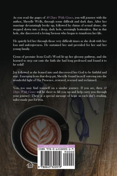 As you read the pages of 40 Days With Grace, you will journey with the author, Sherylle Wells, through some difficult and dark days. After her marriage devastatingly broke up, followed by claims of sexual abuse, she stepped down into a deep, dark hole, seemingly bottomless. But in this hole, she discovered a loving Saviour who began to transform her life. He quietly led her through those very difficult times as she dealt with her loss and unforgiveness. He sustained her and provided for her and her young family. Gems of promise from God's Word lit up her gloomy pathway, and she learned to step out onto the faith she had long professed and found it to be solid! Joy followed as she leaned into and discovered her God to be faithful and true. Emerging from that deep pit, Sherylle found herself entering into the wonderful light of His Presence, restored, rescued and reclaimed. You, too may find yourself on a similar journey. If you are, then 40 Days With Grace will be there to lift you up and help carry you through your journey. There is a special message of hope in each day's reading,tailor-made just for you.