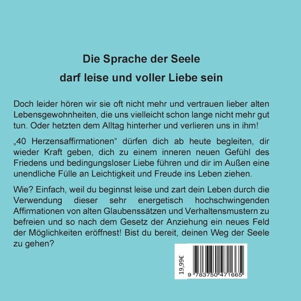 Das Buch "40 Herzensaffirmationen, die dein Leben verändern dürfen" enthält 40 kurze energetisch sehr hochschwingende Afffirmationen, die durch zeitlich wiederholtes Verinnnerlichen das gesamte Unterbewusstsein neu programmieren darf. Das Ziel darf dabei gerne sein, alte Glaubenssätze vollkommen über Bord zu schmeißen. Die dazugehörigen Fragen zu jeder Affirmation dürfen gerne als Erwachen der Seele erspürt werden. Das Ziel dieser wundervollen Affirmationen darf sein, ein erfülltes Leben in purer Freude, Freiheit, Liebe, Reichtum, Weisheit und vollkommener Leichtigkeit sein.