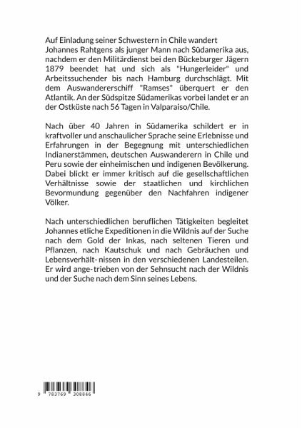 Auf Einladung seiner Schwestern in Chile wandert Johannes Rahtgens als junger Mann nach Südamerika aus, nachdem er den Militärdienst bei den Bückeburger Jägern 1879 beendet hat und sich als "Hungerleider" und Arbeitssuchender bis nach Hamburg durchschlägt. Mit dem Auswandererschiff "Ramses" überquert er den Atlantik. An der Südspitze Südamerikas vorbei landet er an der Ostküste nach 56 Tagen in Valparaiso/Chile. Nach über 40 Jahren in Südamerika schildert er in kraftvoller und anschaulicher Sprache seine Erlebnisse und Erfahrungen in der Begegnung mit unterschiedlichen Indianerstämmen, deutschen Auswanderern in Chile und Peru sowie der einheimischen und indigenen Bevölkerung. Dabei blickt er immer kritisch auf die gesellschaftlichen Verhältnisse sowie der staatlichen und kirchlichen Bevormundung gegenüber den Nachfahren indigener Völker. Nach unterschiedlichen beruflichen Tätigkeiten begleitet Johannes etliche Expeditionen in die Wildnis auf der Suche nach dem Gold der Inkas, nach seltenen Tieren und Pflanzen, nach Kautschuk und nach Gebräuchen und Lebensverhältnissen in den verschiedenen Landesteilen. Er wird angetrieben von der Sehnsucht nach der Wildnis und der Suche nach dem Sinn seines Lebens.